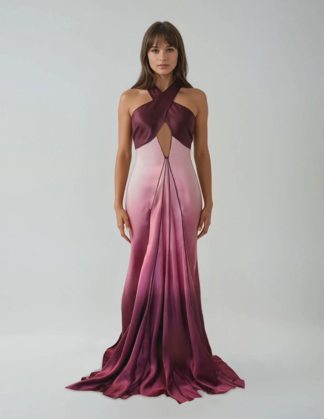A gown that feels like dusk melting into night. The Soleil Gown in Rosé Ombre is crafted from stretch silk charmeuse and hand-dyed in our studio to create a luminous gradient that moves from soft rosé to warm pink to deep oxblood. The effect is cinematic subtle, romantic, and richly dimensional.